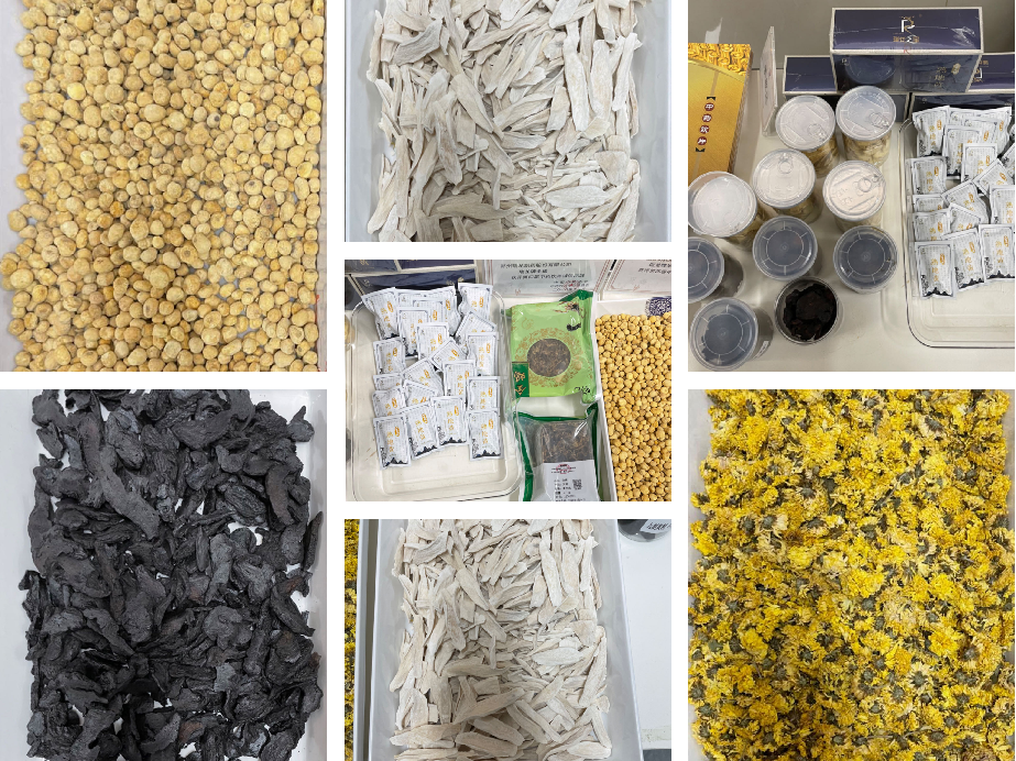 ▲瑞龍制藥的法半夏、懷山藥片、熟地黃、懷菊花等樣品展示